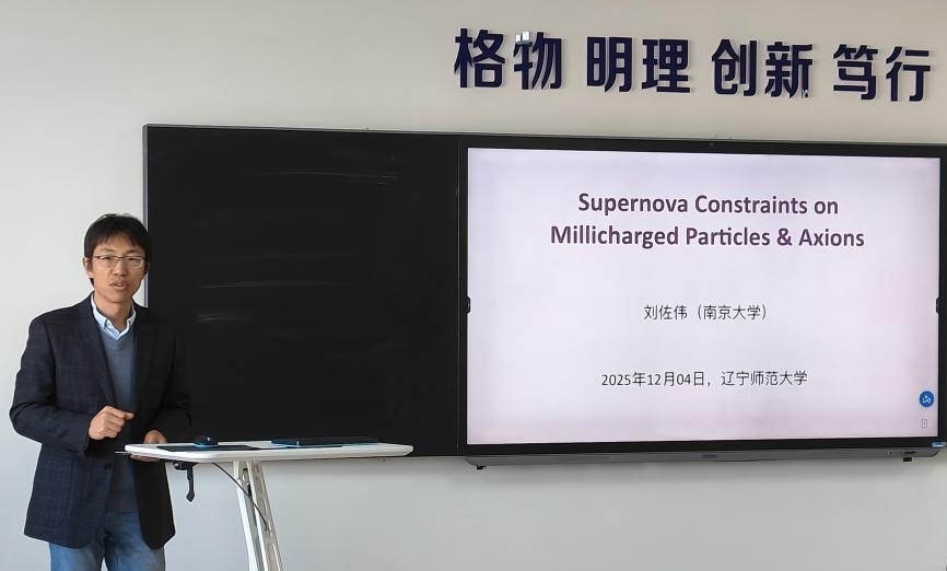报告中,刘佐伟教授围绕超新星对毫电荷粒子、类轴子粒子的约束作用展开深入分享。刘教授从超新星及其相关限制讲起,介绍了其团队近期取得的两项重要科研成果:超新星对毫电荷粒子的约束和超新星对轻子味破坏的类轴子粒子的限制。报告结束后,与会师生围绕相关问题与刘佐伟教授展开了深入探讨。